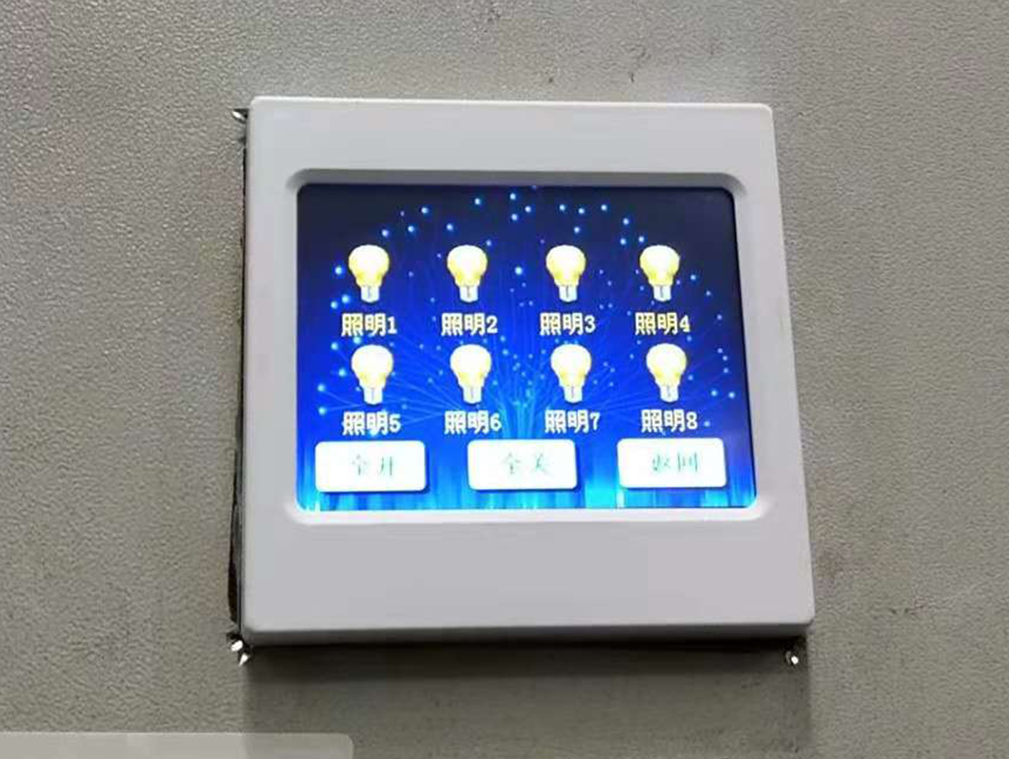 該項目采用的是經(jīng)濟(jì)型的照明控制模塊,如下圖,4回路的,8回路的都有。且由于經(jīng)濟(jì)型模塊不具備遠(yuǎn)程控制功能,所以該項目則是每個電箱配了一個3.5寸觸摸屏。