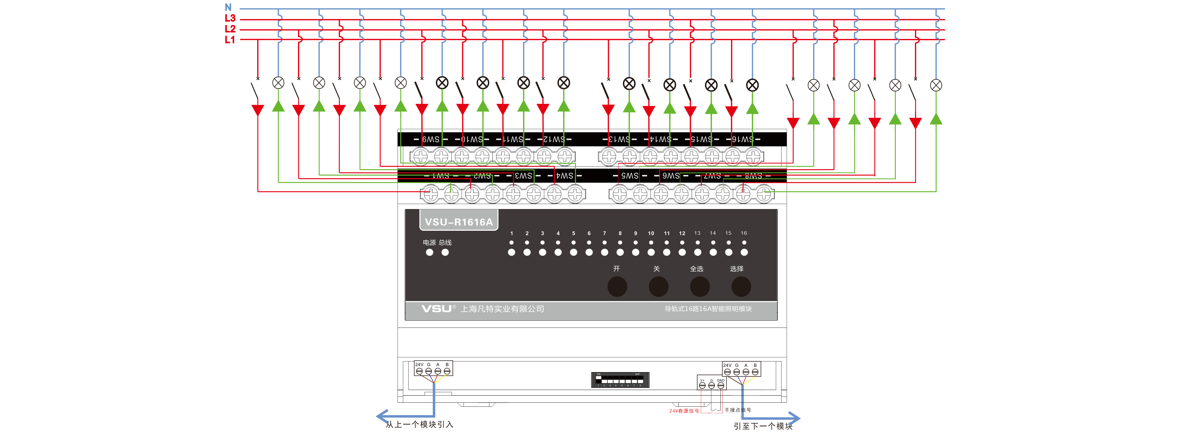 本產(chǎn)品為導軌式安裝,含16路智能繼電器,每回路可獨立控制3520W燈具的開關,帶應急按鍵,LED燈實時指示各個回路開關狀態(tài),可設置為互鎖控制8組窗簾開合; |