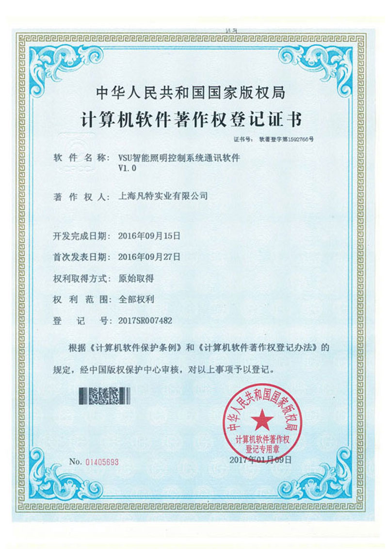 VSU智能照明有多項(xiàng)自主知識(shí)產(chǎn)品證書,所有產(chǎn)品都經(jīng)過國際CE認(rèn)證,符合國際電工標(biāo)準(zhǔn)。