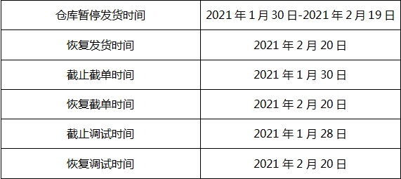 根據(jù)《國(guó)務(wù)院辦公廳關(guān)于2021年部分節(jié)假日安排的通知》,經(jīng)公司研究決定,現(xiàn)將2021年春節(jié)期間倉(cāng)庫(kù)暫停發(fā)貨及暫停調(diào)試通知事宜通知如下: