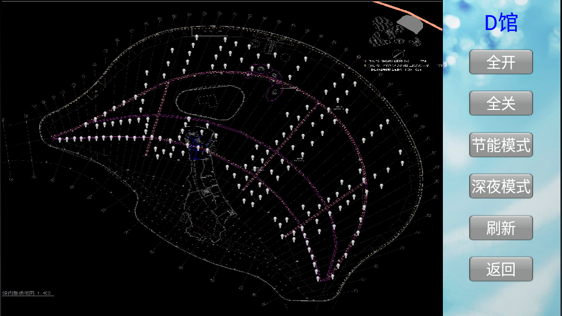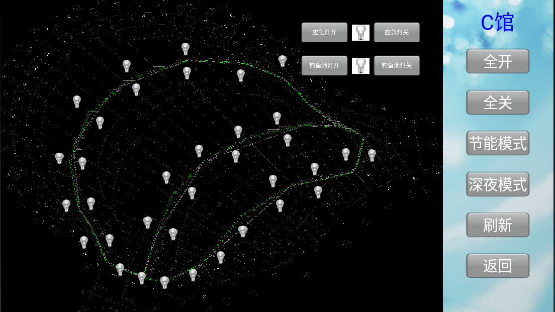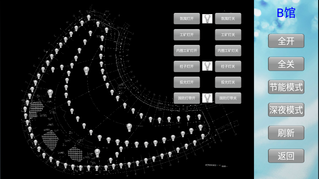 智能照明控制系統(tǒng)對各個(gè)場館內(nèi)的照明納入到統(tǒng)一的系統(tǒng)平臺進(jìn)行集中管理,實(shí)現(xiàn)一鍵全開全關(guān),游樂園可根據(jù)不同節(jié)日預(yù)設(shè)不同燈光場景,增添假日氣氛,也可根據(jù)客流量預(yù)設(shè)燈光(如下圖:節(jié)能模式),在保持照明需求以及氛圍感的同時(shí),實(shí)現(xiàn)節(jié)能減排。