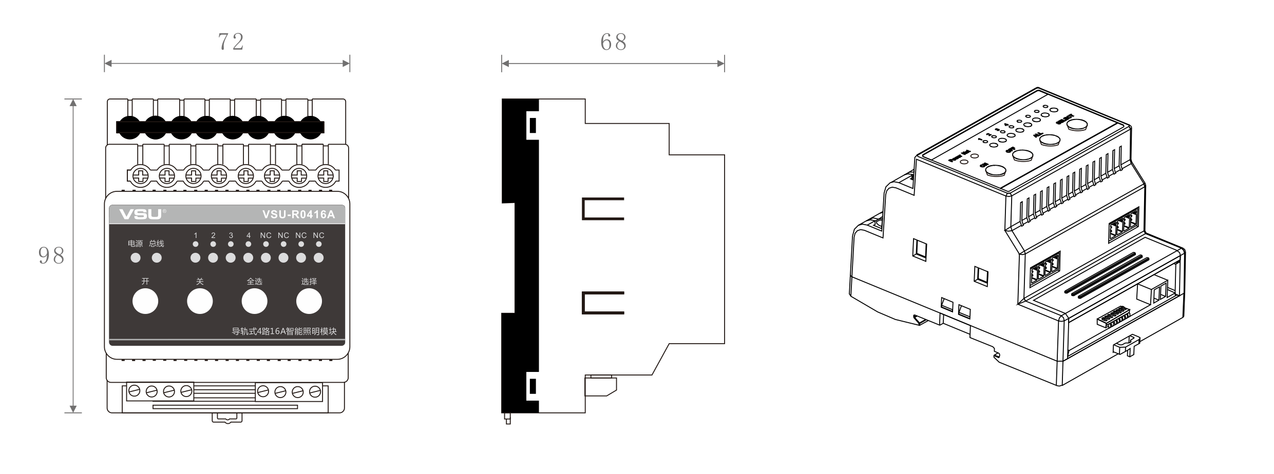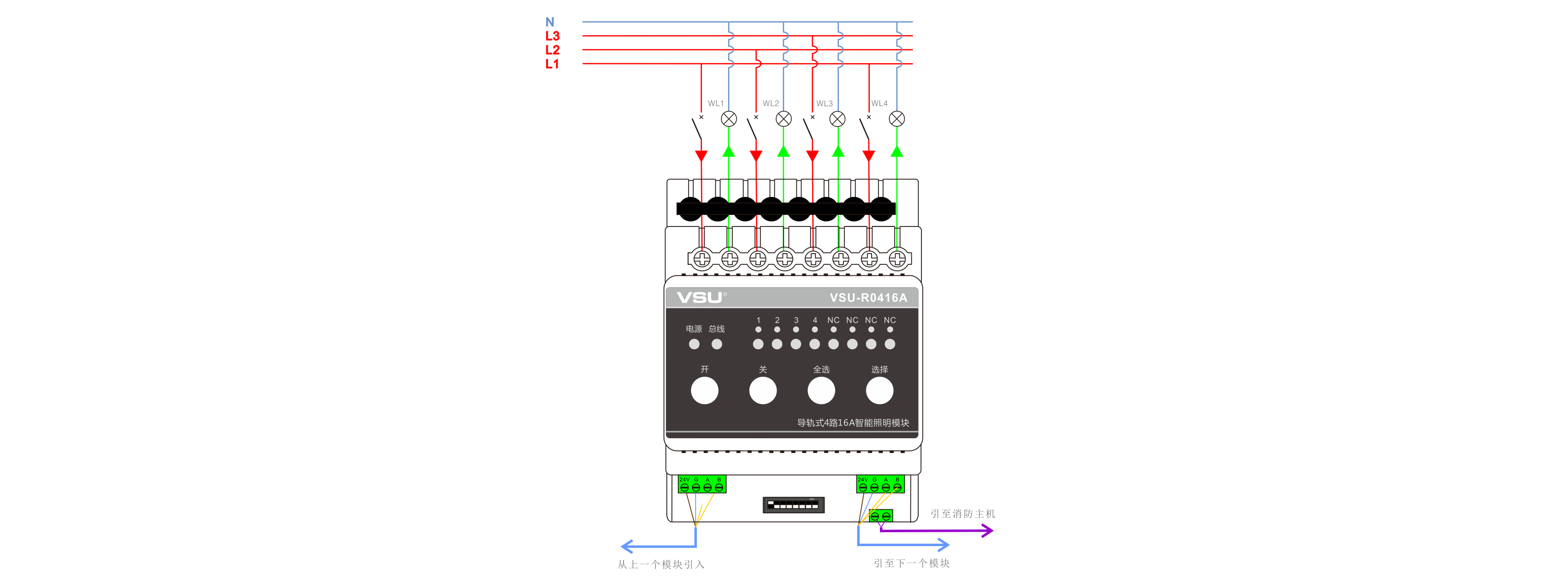 本產(chǎn)品為導軌式安裝,含4路智能繼電器,每回路可獨立控制3520W燈具的開關(guān),帶應急按鍵,LED燈時時指示各個回路開關(guān)狀態(tài)