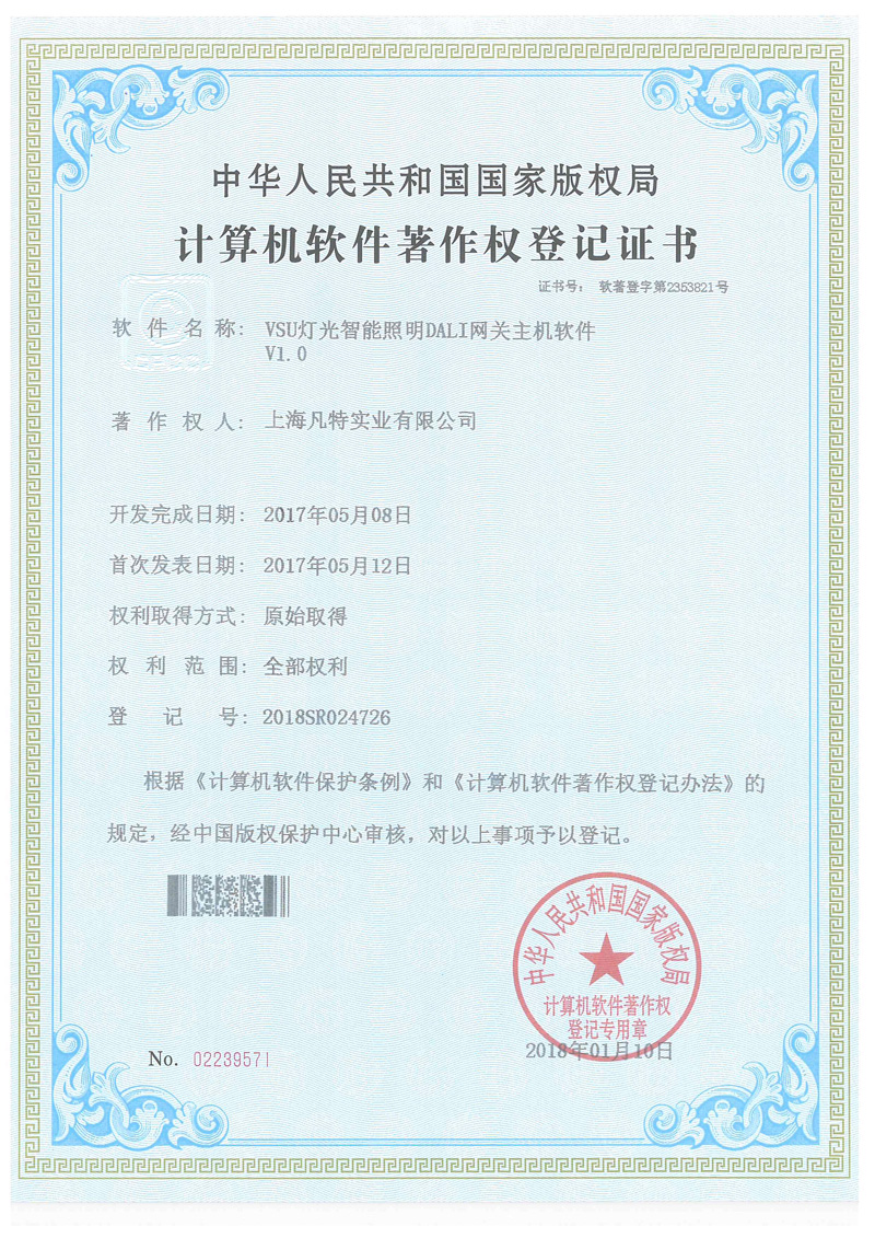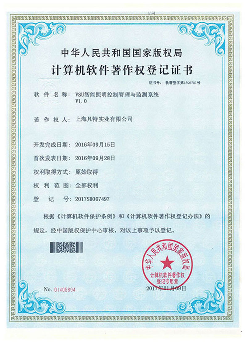VSU智能照明有多項(xiàng)自主知識(shí)產(chǎn)品證書,所有產(chǎn)品都經(jīng)過國際CE認(rèn)證,符合國際電工標(biāo)準(zhǔn)。