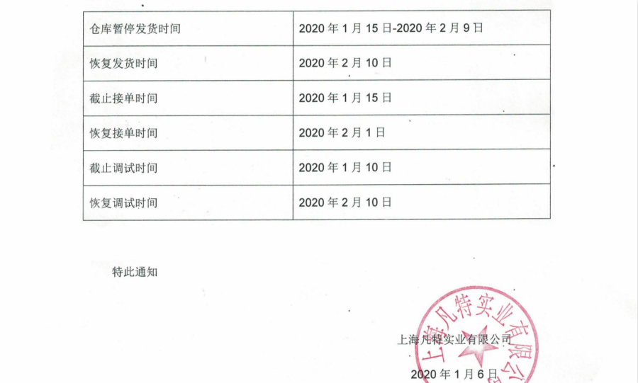 倉庫暫停發(fā)貨時間:1月15號至2月9號; 2月1號恢復(fù)接單; 調(diào)試暫停時間:1月10···